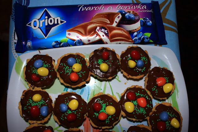 3. A csokoládét az olajjal felolvasztjuk és a kosárkák tetejére öntjük, úgy hogy egyenletesen fedje őket.