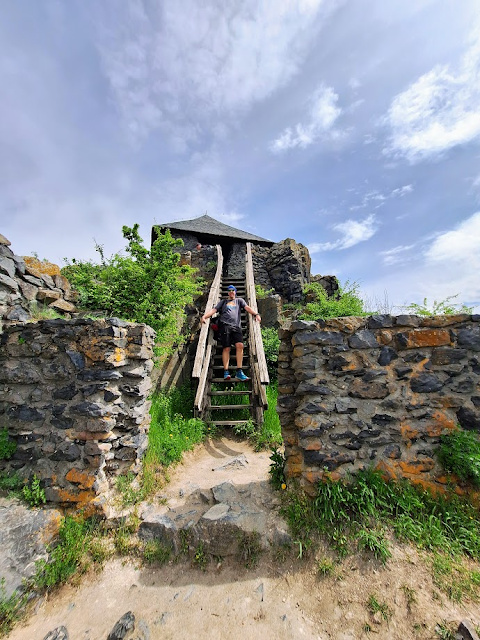 Fent a várban a mesés panoráma mellett újabb bélyegző várt némi nápolyi szelettel és kedves pontőr hölgyekkel. Még felmásztunk a vár legfelső szintjére és készítettünk végre pár közös képet, miközben kicsit csepergett ránk az égből némi eső és fújdogált valami szélféle is. Egészen elkomorodott az idő, hogy aztán újból kividuljon. Aztán megcéloztuk a leírás szerinti famókust, amit meg is találtunk. Tessék, végre lett mókusom, bár magammal nem vihettem ezt a jókora darabot hátizsákdísznek.